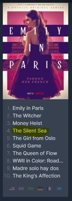 12월 24일 오픈되고 난 하루 뒤 12월 25일 넷플릭스 해외순위가 7위라고 많이 올라왔었는데요. 확인해본 결과 현재는 4위까지 올라와있습니다. 오징어게임이 6위에 랭킹되어 있는데, 오징어게임을 제치고 위로 올라온 모습입니다.