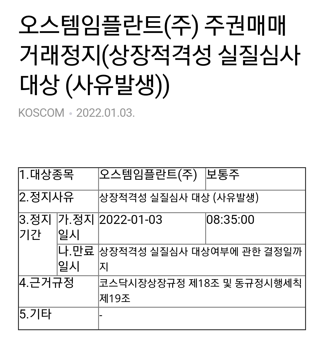 오스템임플란트의 거래정지 소식이 전해졌습니다.그 소식에 놀라신 분들이 많으실 것 같습니다.