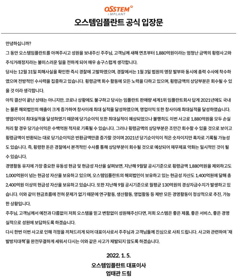 오스템 임플란트 공식 입장에서는 현재 횡령된 금액 외에도 1,000억원이 넘는 현금성 자산을 보유하고 있고 해외법인에서도 1,400억 원에 달해 총 현금성 자산이 2,400억 원을 보유하고 있다고 발표했습니다.