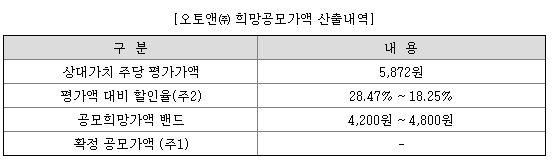 오토앤의 공모가 밴드는 4,200원~4,800원입니다. 이 공모가 밴드는 어떻게 산출되었는지, 할인율은 얼마나 되는지 살펴보겠습니다.