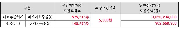 주관사는 미래에셋이며 인수회사는 현대차증권입니다. 배정비율은 미래에셋이 80%, 현대차 증권이 20%입니다. 수량은 미래에셋이 훨씬 많지만 이용자가 미래에셋이 더 많기 때문에 경쟁률은 어떻게 될 지는 지켜봐야 할 것 같습니다.