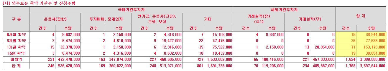 마지막으로 의무보유 확약 수량입니다. 전체 신청 수량 중에서 의무보유확약은 크지 않은 편입니다. 미확약이 91.65%로 확약의 수량은 8.35%입니다. 수요예측 결과를 한 눈에 정리하면 다음과 같습니다.