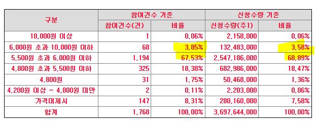 공모가 밴드는 4,200원~4,800원이었는데요.이를 넘어서는 5,000원 초과에서 가장 많은 참여건수를 보였습니다. 최대 10,000원까지 있었는데 5,000원 이상~10,000원 이하에도 약 3.85% 정도의 수요가 있었습니다. 공모가의 밴드를 훌쩍 뛰어넘었다는 점에서도 큰 수요가 있었다 볼 수 있습니다.