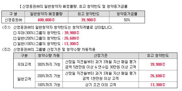 마지막으로 청약한도입니다. 일반 그룹의 청약한도는 13,300주이며 우대등급에 따라 2배, 3배까지 가능합니다. 우대 등급의 기준과 수량은 위의 표를 참고하시기를 바랍니다.