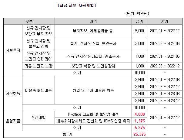 이번 공모를 통해서 증권시장에 상장하게 되며 시설투자와 미술품 구입을 위한 비용을 위해 사용한다고 합니다. 제조, 생산 분야가 아니다 보니 상대적으로 사용될 자금이 적은데요. 시설 투자는 신규 전시장 확보와 인테리어에 사용되고 그 외에는 전산개발에 사용됩니다.