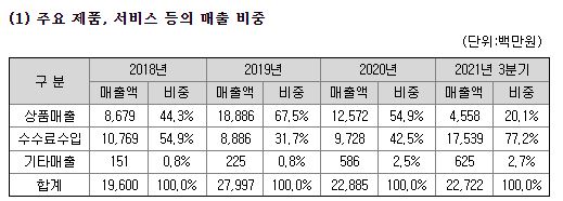 매출의 비중 중 상품 매출과 수수료 수입이 비중이 큽니다. 경매와 미술품 판매를 통해서 발생하는 것으로 보여지는데요. 2020년에 감소했던 매출은 2021년 다시 증가하고 있습니다.