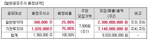 총 모집 주식 수는 1,360,000주 입니다. 이중 일반 청약자의 수량은 25%, 기관의 수량은 75%입니다. 10주를 공모한다면 10주를 다 받을 수 있을 것 같지만 상장일 주가가 공모가를 지켜낼지는 의문입니다.