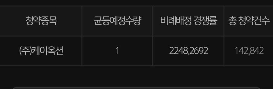 오후 한시 37분 현재 2248대 1을 넘어섰고 총 청약건수는 142842건입니다. 역시나 균등예정수량은 1입니다.