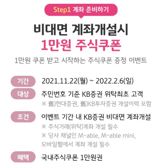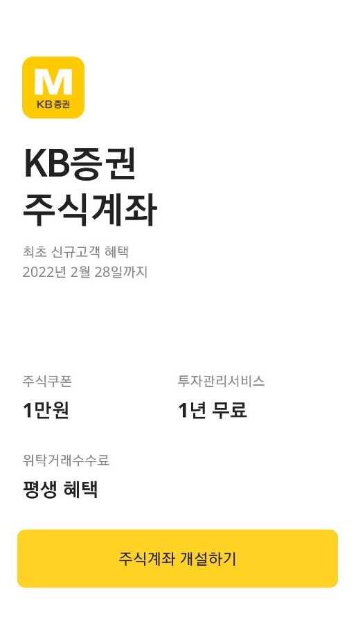 2022년 2월 26일까지 가입고객에게는 1만 원 국내 주식 쿠폰 증정합니다. 국내 주식 쿠폰 1만 원을 받을 수 있는 조건은 주민번호 기준 kb증권 최초 고객이어야 합니다.
