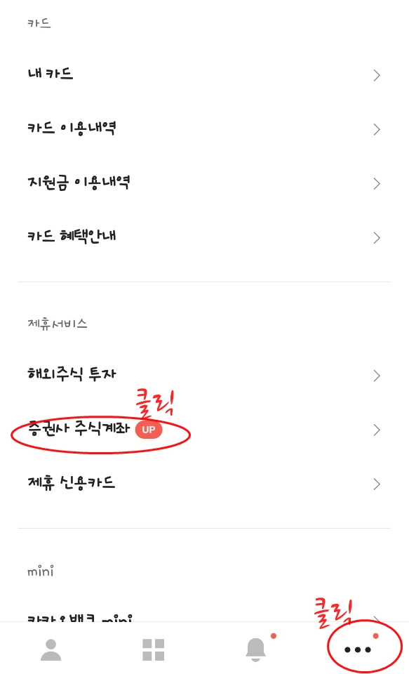 카카오뱅크에 접속하면 메인 하면 위에 빨간 박스를 친 부분에 주식 계좌 개설 이벤트가 뜨는 경우가 있습니다. 그렇다면 그걸 클릭해서 들어가도 되는데요. 그렇지 않은 경우 하단 아래쪽에 점 세개 버튼을 클릭후 아래로 내려서 증권사 주식계좌 버튼을 클릭합니다.