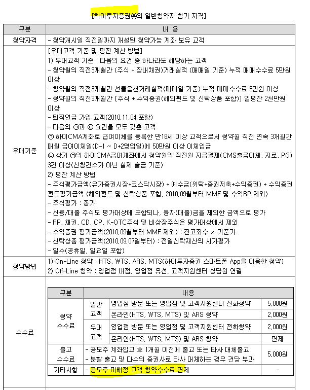 하이투자증권의 경우, 무 배정시에도 수수료가 있다는 글들도 종종 봤는데 이후 수정을 한 건지, 공모주 미배정 고객에게 청약 수수료 면제라고 되어있습니다.