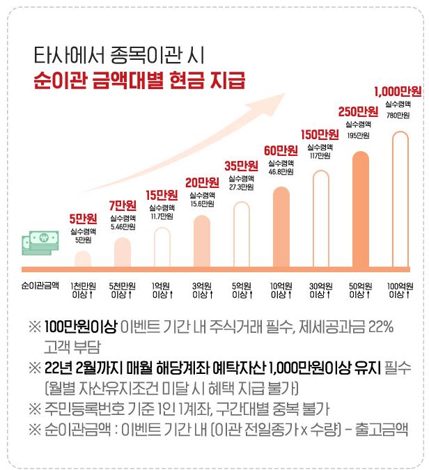 또 그 다음달 부터 매월 100만원이상 거래, 10만원 이상 자산 유지시에는 매월 1만원씩 6개월간, 6만원을 받을 수 있습니다. 타사에서 종목 이관시에는 순이관 금액대별 최대 1000만원을 지급하는 이벤트도 있으니 해당되시는 분들은 확인해 보시면 좋을 것 같습니다.