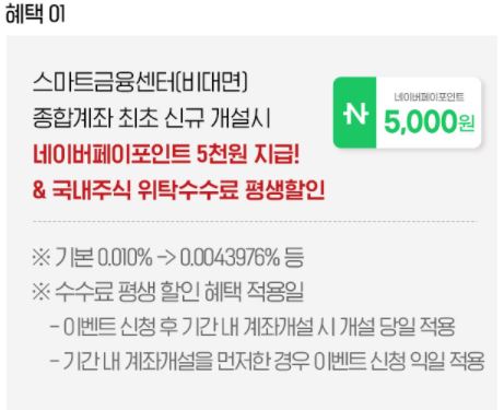 바로 5천원 포인트 제공입니다. 네이버페이를 통해서 하시거나 오케이 캐시백을 통해서 하실 때만 가능합니다. 그리고 국내 주식 수수료를 평생할인 받을 수 있습니다. 이는 sk증권 홈페이지에서 해도 동일한 혜택인데요. 5천원 추가 포인트 지급은 ok캐시백과 네페에서만 지급합니다.