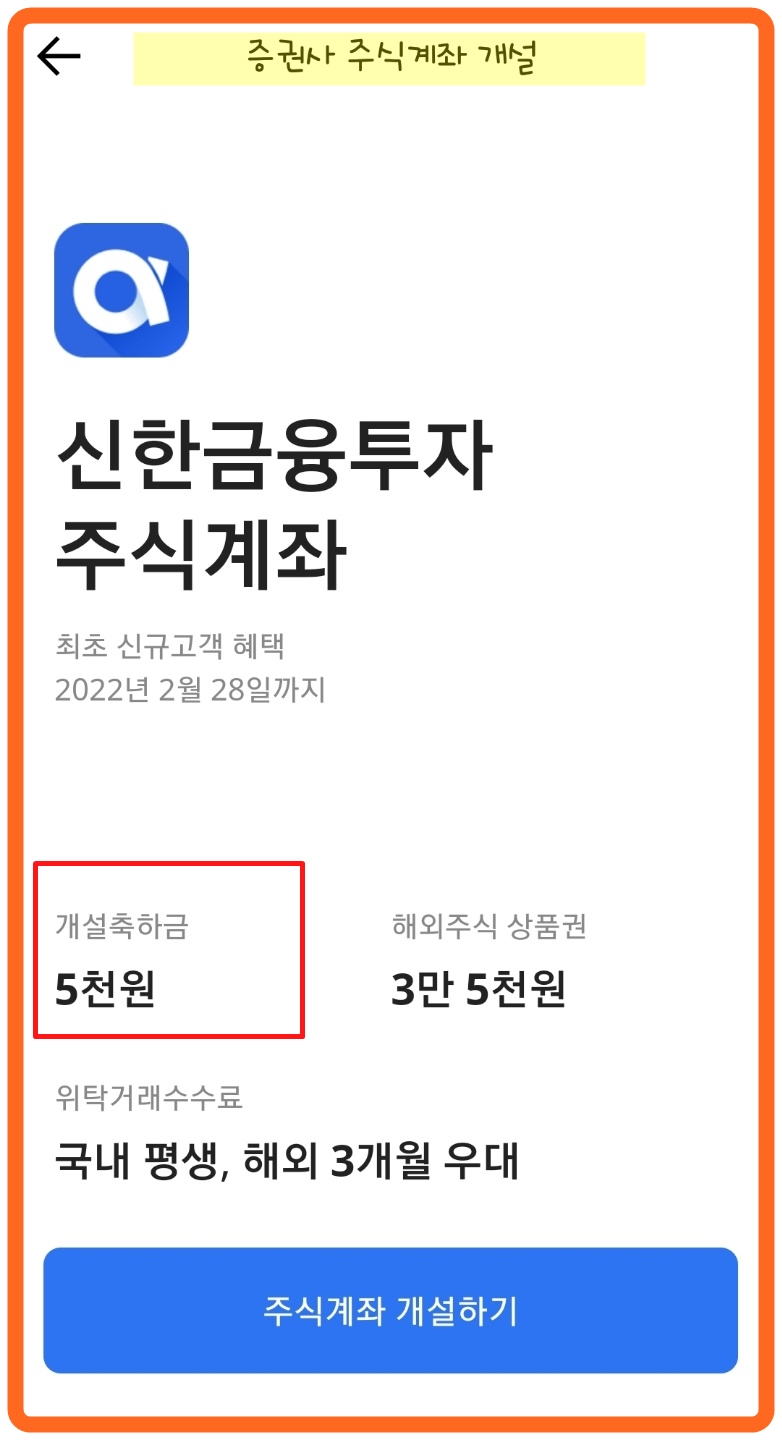 20일 제한 없이 가능한 카카오뱅크를 통해서 신한금융투자 비대면 계좌개설을 하게 되면 3가지의 사항의 이벤트에 해당됩니다. 우선 개설축하금이 5천원입니다.