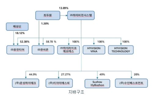 퓨런티어는 하이비전시스템의 자회사이며, 이에 따라 지분구조가 나누어져 있습니다.