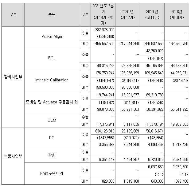 삼성전기의 A향, 세코닉스의 E향 전장카메라 제조라인에 납품을 하고 있으며,미국 시장 등으로 해외 진출도 하고 있습니다.