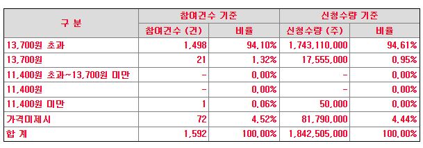 공모가 밴드는 11400원에서 13700원인데요. 13700원 초과의 비율이 상당히 높았습니다. 그래서인지 공모가 산정이 더 높게 되었습니다.