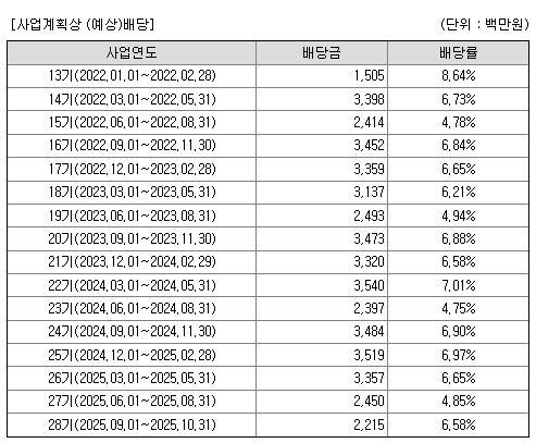 이번에 상장하는 코람코더원리츠는 분기 배당으로 2월, 5월, 8월, 11월 4번 예정이며, 평균 수익률은 6.2%정도 예상된다고 합니다.