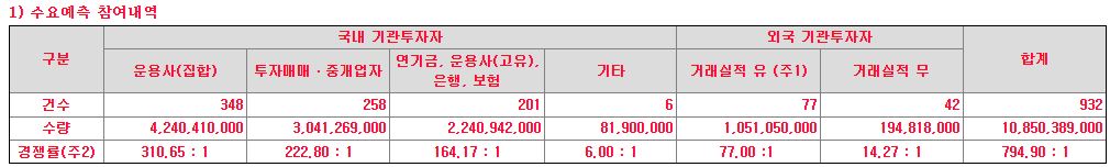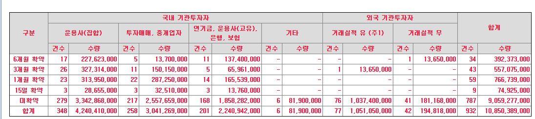 확약 분포는 국내기관투자자 위주로 되어있는데요. 미확약이 훨씬 더 많은 편입니다.