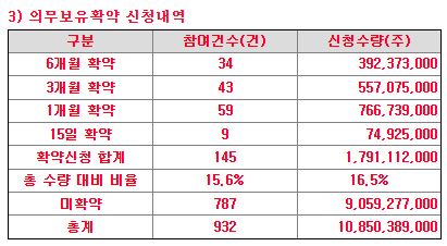 총 수량 대비 의무보유확약 신청 비율은 15.6%입니다. 의무보유확약은 그리 높지는 않은 편입니다.