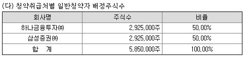 총 공모 주식수는 19,500,000주로 일반 청약자의 물량은 그 중 30%인 585만주입니다. 이를 하나금융투자와 삼성증권에서 반씩 나눠서 청약을 진행합니다.