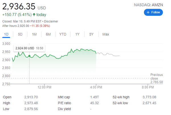 아마존의 주가는 9일 종가 기준으로 2785.58달러이며 액면분할이 이루어지면 주당 139.28달러가 됩니다. 액면 분할된 아마존 주의 거래는 6월 6일에 시작 될 예정입니다.