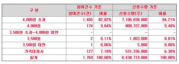 공모가 밴드는 35,00원~ 4,000원 사이였는데요. 4,000원의 초과비율이 가장 높았고 이에 따라 공모가는 상향 되었습니다.