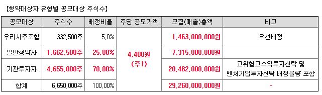 이번 공모 주식수는 총 6,550,000주입니다. 우리사주 조합을 제외하고 일반 청약자에게는 1,662,500주 약 25%의 물량이 주어지는데요. 이는 전체 주식수에서는 6.27%정도 비율을 차지합니다.