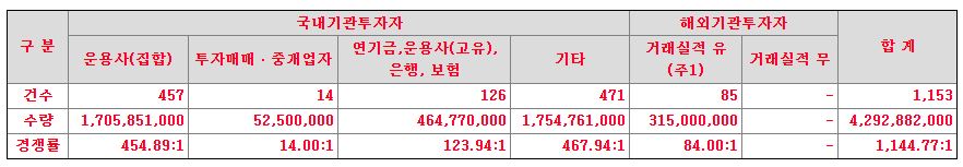 수요예측 경쟁률은 1144대 1입니다. 같은날 청약하는 지투파워보다는 낮지만 다른 공모주들에 비하면 높은 편인데요. 최근에는 인기 없는 종목은 십의 자리가 나오기도 하고 백의자리가 나오기도 하고 경쟁률이 매우 낮은것에 비하면 높은 편입니다.