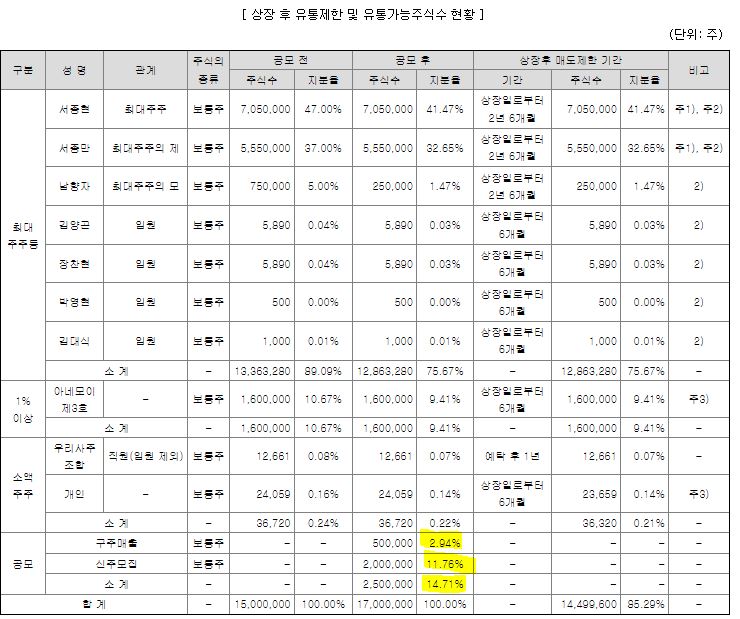 기존에 유통가능 물량이 많고 구주 매출이 높은 것이 수요예측에 악영향을 주었기 때문이라고 판단했는지, 이번에는 상장일 당일 유통물량이 확 줄었습니다.