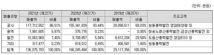 현재 공사의 비중이 더 높은 편이며, 주요매출처로는 원동 풍력발전, 영암태양광발전, 굼성산풍력발전 등이 있습니다. 설비 공사 뿐 아니라 용역과 발전도 점차 매출이 증가하고 있습니다.
