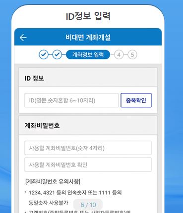 ID와 비밀번호를 설정하는데요. 이걸로 홈페이지나 앱에 로그인이 가능합니다. 앱에서는 아이디 로그인도 가능하지만 간편 비밀번호를 설정해두면 이걸로도 로그인이 가능한데요. 이체, 주문 등 거래에도 사용이 가능한 번호입니다. 이거만 설정해두면 앱에서는 간편하게 이용할 수 있습니다.