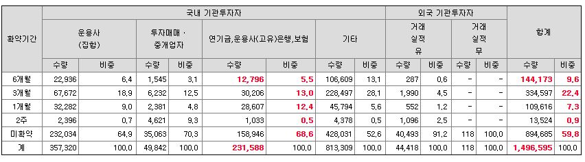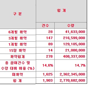 최종 확약수치입니다. 미확약이 59.8입니다. 확약은 40.2 입니다. 굉장히 높은 수치로 올랐습니다. 확약비중이 높아지면서 당일 유통물량은 더 적어지게 되었습니다.