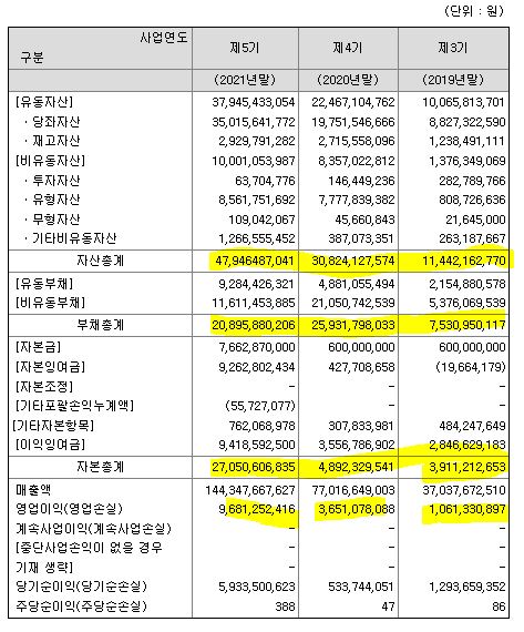 이를 바탕으로 요약재무제표를 살펴보면 자산증가, 부채 감소, 영업이익 증가 등 꾸준한 성장을 하고 있음을 알 수 있습니다.
