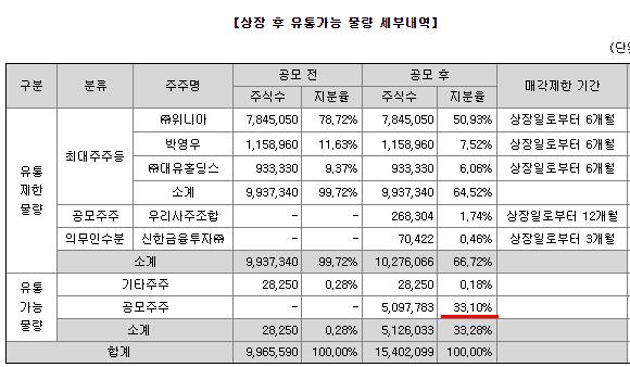 상장 일정에 앞서 미리 알아봐야 할 것은 유통가능 물량입니다. 공모주주의 수량인 33.10%외에 약 0.18%의 물량만 유통이 가능합니다.