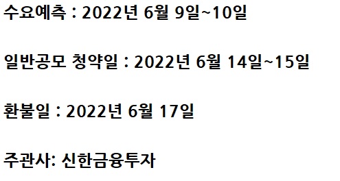일반 공모자의 청약일은 6월14일~15일이며, 환불일은 6월 17일입니다.