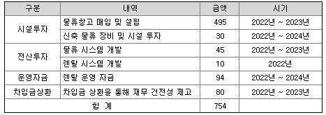 이번 공모자금으로 모인 금액으로는 차입금 상환, 시설투자, 전산투자, 렌탈 운영자금 등에 쓰일 예정입니다. 가장 많은 분야는 물류 창고 신축입니다. 물류쪽 역량을 더 강화하고자 하는 것으로 보입니다.
