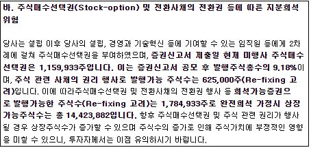 또 미행사 된 주식매수 선택권과 전환사채 전환권 등이 있어 상장 후 주식 가치가 희석될 가능성이 있습니다.