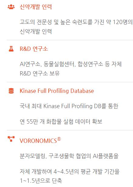 전문성과 숙련도를 가진 약 120명의 신약 개발 인력이 있고, 자체 R&D연구소를 보유 하고 있습니다. 여기서는 AI연구소, 동물실험센터, 합성연구소 등 자체 연구를 하고 있습니다.