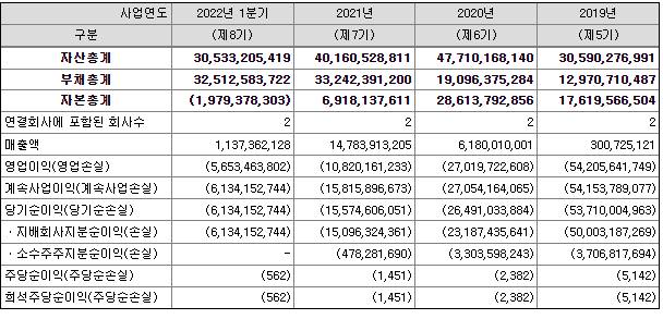 보로노이 공모주의 요약재무정보 중에 자산총계, 부채 총계, 매출액과 영업이익 등만 가져왔습니다. 2021년 매출은 감소했지만 영업손실은 줄어들었습니다.