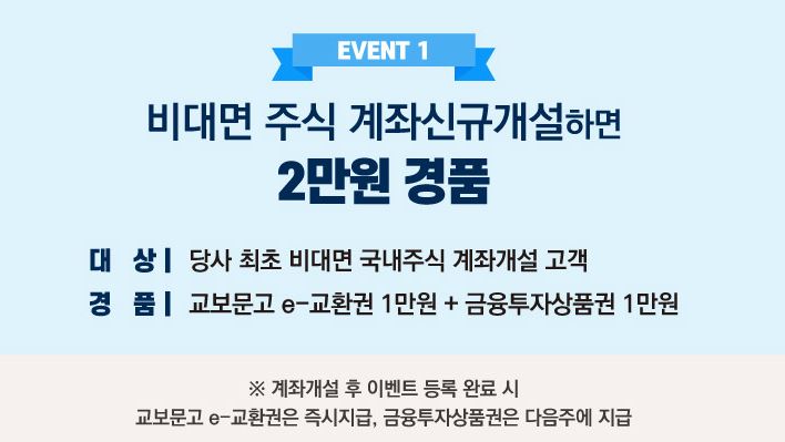 교보증권 비대면 계좌개설 이벤트는 신규 계좌에 한 하여 2만원 상당의 경품을 받을 수 있습니다. 교보문고 1만원 교환권과 금융투자 상품권 1만원입니다. 금융투자 상품권은 가입 후 1주가 지나면 받을 수가 있습니다.