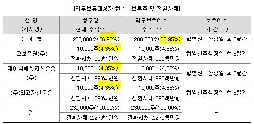 더벨 외에는 교보증권, 제이씨에셋자산운용, 리코자산운용이 4.35%의 지분을 각각 가지고 있습니다. 이들의 지분은 합병신주 상장일 후 6개월간 매도가 금지되며, 그 외 스팩 공모 수량은 IPO 상장 이후 모두 유통이 가능합니다.