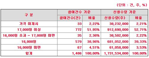 희망공모가 밴드를 초과한 확정공모가액이 결정되었습니다. 16,000원 이상을 희망한 비율이 전체의 94.26%나 되었습니다. 할인율이 대폭 낮아졌는데요. 주당 평가가액이 16592원으로 16000원이 결정되어 할인율은 약 3.5%정도입니다.