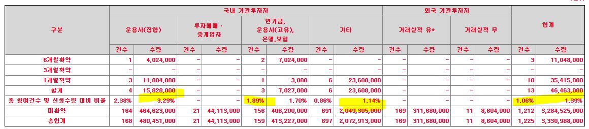 기관 수요예측 경쟁률은 955대 1입니다. 레이저쎌에 비하면 조금 낮지만 양호한 수준입니다. 최근에 아주 낮았던 두자리 수의 기록에 비하면 좋은 성적표이기도 합니다. 특히 국내 기관투자자 중에 기타에서 참여율이 높았습니다.