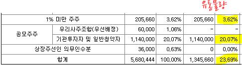 상장일 유통 가능 물량은 총 23.69%입니다. 전체에서 20.07%가 공모주주인데요. 이 중에서 의무 보유확약이 빠져나가고 나면 더 줄어들 예정입니다. 15~18%정도 차지 하지 않을까 싶습니다. 물론 확약이 나와봐야 알 것 같습니다.