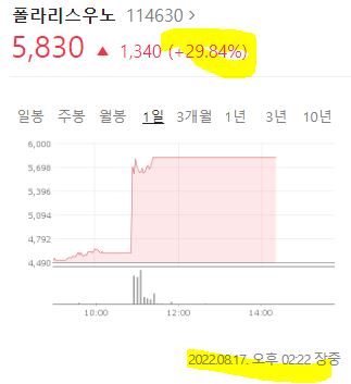 폴라리스우노는 매출 상승과 이에 따른 무상증자로 인해 상한가를 기록했습니다. 2분기 실적발표가 쏙쏙들이 되면서 매출이 상승한 기업들은 주가가 반등하기도 하지만 상한가를 달성하는 일은 드뭅니다. 주주환원 정책까지 함께 가져오니 상한가로 한번에 올라주는 모습을 보여주었습니다. (2022년 8월 17일)