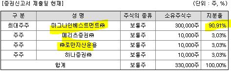 최대주주는 마그나인베스트먼트입니다. 90%대의 지분을 가지고 이습니다. 그 외에는 메리츠증권, 로만자산운용이 3.03% 참여합니다. 하나증권에서 주관하니 하나의 참여는 당연한 부분입니다.