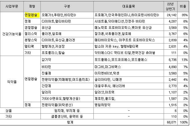 제품군입니다. 제일 높은 부분은 역시 연질캡슐로 35%입니다. 건강기능식품 비율이 더 높은 부분을 차지하고 있습니다. 의약품에서도 연질캡슐 부분에서 매출이 발생하고 있습니다.