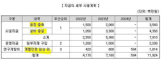 이번 공모자금으로 공장 증축과 설비를 증설할 계획입니다. 그 외에는 원부자재 구입에 많은 비용을 사용할 예정인데요. 가장 많은 부분은 시설자금입니다. 대출자금을 갚거나 운영비로 쓰는 것보다는 시설 증설에 더 많은 투자를 하여 사업을 확장하려고 공모를 한다고 보시면 될 것 같습니다.