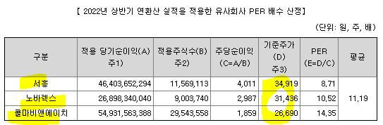 비교그룹은 서흥, 노바렉스, 콜마비앤에이치 입니다. 기준주가가 평균으로 약 3만원정도 됩니다. 정확히는 31,000원대입니다.per평균은 11.19를 적용했습니다. 제약분야와 매출이 꾸준히 잘 나오고 있는 기업을 기준으로 비교그룹을 선정했다고 합니다.